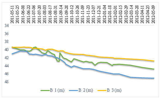 Water changes of three boreholes, B1, B2, and B3, monitored between 2011 and 2012, located in the northern part of the study area (modified after [16]).