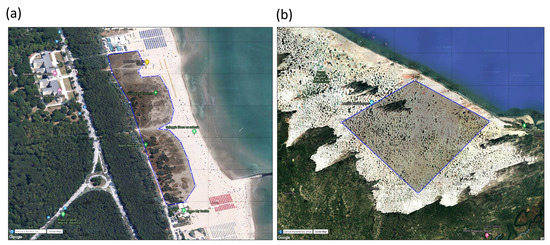 For each site, a region of interest (ROI) was defined; Figure 2 shows two examples. The ROI included the entire dunefield when it was relatively small and had a clear perimeter (e.g., Figure 2a). Otherwise the ROI was a subset of the dunefield (e.g., Figure 2b) but always included the dune closest to the ocean as well as further inland located dunes. The polygon defining the outline of the ROI was drawn by visual interpretation based on high-resolution Google Earth Pro images. At most sites the beach–dune boundary was the most seaward location of the vegetation, see for an example Figure 2a. This boundary was more approximate at sites with sparse vegetation (e.g., Figure 2b). The median ROI area amounted to 3.5 km2, with the 10th and 90th percentiles being 0.42 and ≈35 km2, respectively. The smallest and largest areas were 0.03 km2 (Marina di Ravenna, Italy [35]; Figure 2a and ≈275 km2 (the transgressive Lençóis Maranhenses dunefield in NE Brazil [45]; Figure 2b), respectively. The area of each ROI can be found in Supplementary Table S1.