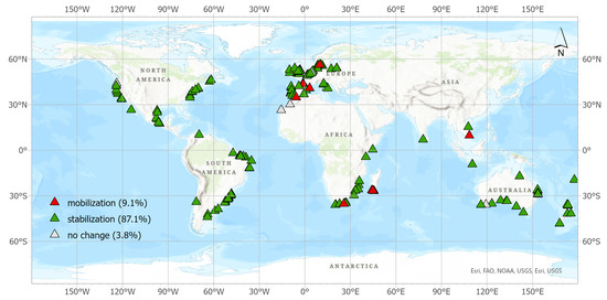 The spatial distribution of the trends based on the Mann–Kendall test is provided in Figure 4. Of the 186 sites, 162 (87.1%) became greener, 17 (9.1%) mobilized, and 7 (3.8%) remained stable over the study period. Figure 4 thus reconfirmed a clear dominance of the greening trends globally. The magnitude of change, , is shown in Figure 5, in which the positive were grouped to roughly depict (1) slowly increasing ( per year); (2) moderately increasing ( per year); (3) rapidly increasing ( per year); and (4) very strongly increasing ( per year) greenness. The strongest positive trends were identified at several locations: Ovari dune site, Southeast India, Thua Thien, Vietnam and Parangritis, Indonesia, as well as on the eastern Australian coast and in New Zealand. Rapid increases in greenness were also found in NW Europe. Figure 6 aggregates the geographical distribution in Figure 5 by showing the frequency of the four as a function of latitude, with latitude reflecting the regional variability of the climatic drivers, such as rainfall, temperature and wind regime (e.g., [39]). A large percentage of sites in the temperate zone, defined here between 35 and 66.5 north/south latitudes, fell in the range of moderate slopes (45 out of 85 sites; 53%) and less in the lowest slope range (35%). Dunes from the subtropics (between 23.5 and 35 north/south latitudes), on the other hand, mostly experienced a slowly increasing greenness (25 out of 52 sites; 48%) and to a lesser extent moderate increases (34%). The six sites with the highest were from both tropical regions (India, Indonesia and Vietnam) and subtropical regions (Brazil and Australia). Finally, the 17 cases with per year included some of the few dune systems in Europe that are mobile on a large scale today, such as the Dune du Pilat in France (the tallest sand dune in Europe), Valdevaqueros and Bolonia dunes in Spain, and the cliff-top Rubjerg Knude dune in Denmark, but were also found in Africa (e.g., Ampalaza Chevron in Madagascar) and Asia (e.g., Phan Thiet, Vietnam).