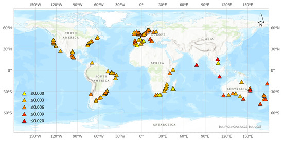 To further examine the intersite variability in coastal dune greening, we explored whether there was a dependence of on the temporal mean greenness, , here defined as the temporal mean of the trend component. The in our data set of greening and mobilizing dune sites, visualized in Figure 7, varied between 0.049 for the Guerrero Negro barrier islands in Mexico (arid conditions) and 0.605 for Brownslade Burrows in Wales (cool temperate climate), with a data set mean of 0.290. From all dune sites with within the largest 25% of the data set, approximately a third originates from Europe. A visual comparison of Figure 5 and Figure 7 shows that greening took place for the entire range of ; in other words, there was no threshold that separated greening from mobilizing dunes. Next, the frequency distribution of was constructed conditional on to provide further information on their dependence. To this end, the greening sites were classified as sites with predominantly bare soil or sparse vegetation () and largely vegetated surfaces (), while for , the four rate categories defined in the previous paragraph in conjunction with Figure 5 were used. It can be seen in Table 1 that 57% (51 out of 89) of the sampled dune sites with no or limited vegetation had some of the lowest trend slopes ( per year), while the rate of change for 58% (42 out of 73) of the well-vegetated dunes was moderately large ( per year). This suggested that larger ’s were associated with larger ’s. A Chi-square test of independence confirmed this association. The value for the data in Table 1 was 17.86, which is well above the critical for independence with and three degrees of freedom. This reaffirmed the inferences drawn from Figure 6, as most sites with a high were from the temperate zone (between 35 and 66.5 north/south latitudes, Figure 7).