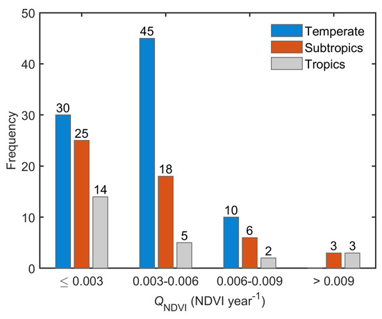 The frequency of various classes of Sen’s slope, , for different latitudes (temperate, between 35° and 66.5°; subtropics, between 23.5° and 35°; and tropics, between 0° and 23.5° north/south latitudes).