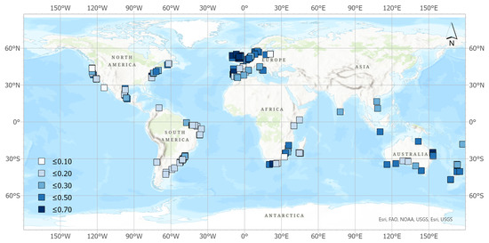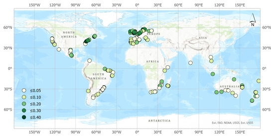 The intersite variability in greening was also compared with the strength of the seasonal component in , denoted here as and calculated as the range between the 10th and 90th percentile of the zero-mean seasonal component . A joint visual inspection of the maps of (Figure 8) and greening (Figure 4) revealed that greening also took place irrespective of the strength of the seasonal . The largest ’s were found in dune fields in cool to warm moist conditions, most notably in Northwestern Europe and on the East coast of the US (Figure 8). In Northwestern Europe, varied between 0.103 at Anholt Island in Denmark and 0.298 at Brownslade Burrows in Wales. The lowest value in our data set was reached for the dry conditions of Guerrero Negro, Mexico (=0.009), and the maximum value was 0.345 for the Greenwich dunes in Canada with cool temperate moist conditions. As expected, depended on . The majority of greening sites with had values less than 0.1 (76 out of 89 sites; 85%), while at sites with mostly had values in the range of 0.1–0.2 (34 out of 73 sites; 47%) and 0.2–0.3 (22 out of 73 sites; 30%).