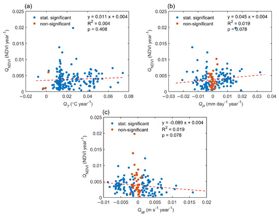 Sen’s slope versus the Sen’s slope in (a) temperature , (b) precipitation and (c) wind speed for the greening dune sites. Blue and brownish dots indicate whether Sen’s slope in the climate variables is statistically significant, see also Table 3. The red line in each panel is the best-fit linear line, with details given in the upper right. None of these lines is statistically significant at .