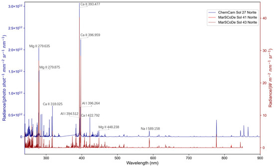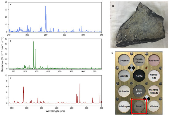 - Anderson, D.E.; Ehlmann, B.L.; Forni, O.; Clegg, S.M.; Cousin, A.; Thomas, N.H.; Lasue, J.; Delapp, D.M.; McInroy, R.E.; Gasnault, O.; et al. Characterization of LIBS emission lines for the identification of chlorides, carbonates, and sulfates in salt/basalt mixtures for the application to MSL ChemCam data. J. Geophys. Res. Planets 2017, 122, 744–770. [Google Scholar] [CrossRef]