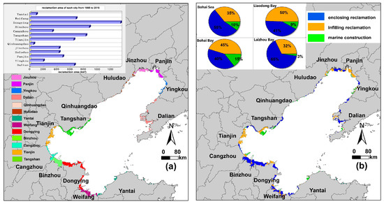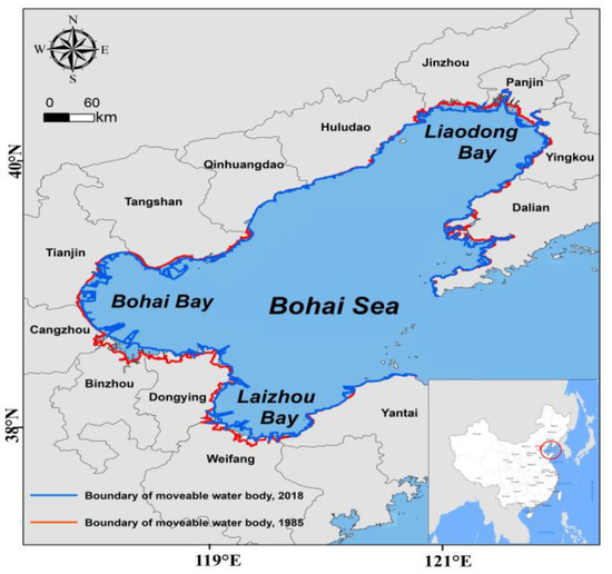 The Circum-Bohai-Sea region has one of the densest populations and the highest degrees of urbanization and industrialization in China. At the end of 2019, the Circum-Bohai-Sea region had a total population of 0.25 billion, accounting for 17.1% of the population of China, with an annual GDP of 1.8 × 105 billion yuan, 20.8% of the GDP of China [1]. Rapid economic expansion and accelerated population growth in the Bohai Sea have caused a sharp increase in land reclamation [2,3]. Between the 1950s and 1980s, reclamation of cultivated land in succession for the coastal area was focused on agricultural development and food production. Between the 1980s and 2000s, coastal reclamation was aimed at increasing salt and agricultural production. In recent decades, driven by the fast-growing economy from 2000 to 2018, Bohai Rim city aggressively expanded coastal industries and urbanization, which resulted in an increasing demand for reclamation. Along with the rapid development of the Bohai Sea, the high-intensity reclamation activities have already caused severe challenges to its ecological environment and the ecosystem service functions, especially the widely distributed and typical coastal wetlands of the Bohai Sea [4]. According to the 2018 Bulletin of China’s Marine Ecological Environment, Ministry of Ecology and Environment of the People’s Republic of China (2019), the Bohai Sea—as a part of the Western Pacific Ocean and China’s inland sea, with land from three directions, surrounded by Liaoning Province, Hebei Province, Shandong Province, and Tianjin City, and connected with the Yellow Sea through the Bohai Strait—is the sea area with the most prominent marine ecological problems, e.g., pollutant emission, oil exploitation, and coastal reclamation in northern China [5,6]. The ecological degradation problems of the Bohai Sea are mainly within its coastal waters, especially those near the Liaodong Bay, Bohai Bay, and Laizhou Bay [7,8]. Therefore, since the “Action Plan for the Integrated Management of the Bohai Sea” jointly issued by the Ministry of Ecology and Environment, the National Development and Reform Commission, and the Ministry of Natural Resources in November 2018, the most stringent management and control of sea reclamation has been implemented in the Bohai Sea area in order to continually improve its coastal ecological functions and gradually restore its fishery resources.