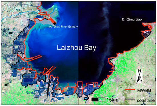 The coastline is the boundary between the sea and the land, namely the outline of a coast [20]. In this study, the MWBB was defined as the solid boundary (for example, breakwaters, bridges, and artificial reefs) blocking the movement of the sea and destroying its connectivity at the intersection of land and sea. The main difference between coastline and MWBB is in their natural attributes. The natural attributes of land and sea, which are emphasized by traditional coastlines, are important indicators of ocean management. For example, in the sea surrounding the areas used for mariculture, the sea is still the sea, but it has changed from a naturally moving water body to a basically non-moving one, indicating that its physical and chemical properties have not changed, but its movement characteristics have changed. However, the hydrodynamics, as an important factor affecting the ecological health of the coastal water, is not reflected in the definition of traditional coastline. Therefore, studies based on traditional coastline changes cannot reveal the impact of human activities in the coastal water, which makes ocean management based on ecosystems impossible to implement. On the contrary, with the method of defining and extracting the spatial position of the MWBB in the coastal water, it takes into account whether the sea area reclamation has hydrodynamic conditions and seawater exchange capacity as the foundation to reveal the ecological effect and development of the reclamation and allows for the study of the marine ecological and environmental protection. In this paper, according to Suo et al.’s coastline extraction method, the spatial positions of the two lines were described under the same remote sensing image, and the two lines showed significant spatial heterogeneity, as in Laizhou Bay (from the Yellow River Mouth to Qimujiao), shown in Figure 3 [21].