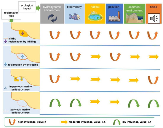 The reclamation through infilling, with an engineering process similar to that of impervious marine construction, will change the natural properties of the ocean significantly, such as changing the sedimentary environment and hydrodynamic conditions, encroaching on the biological habitats, destroying the marine biodiversity, and generating noise and pollutants during the construction and development. However, the area of impervious marine construction is usually very small, and it has a high impact only on the sedimentary environment through noise pollution [15,25]. The enclosing reclamation and pervious marine constructions (dams or buildings in the reclaimed area) can partially change the natural properties of the ocean, and the enclosing reclamation has a high impact on the hydrodynamic conditions, marine biodiversity, and pollutant emission. Most pervious marine constructions are cross-sea bridges. During their construction and usage, pollutants can be produced which threaten the biodiversity [5]. Additionally, noise pollution caused by shipping activity in ports and marinas showed the greatest extent of modification. Compared with ports, the noise pollution caused mainly by vehicles on the road, bridges, industries, and urban areas, is relatively weak compared with ports and marinas [26]. Therefore, in this study, the cumulative ecological impact values of infilling reclamation, enclosing reclamation, impervious marine construction, and pervious marine construction were set as 6.0, 4.5, 4.0, and 1.4, respectively (Figure 4).