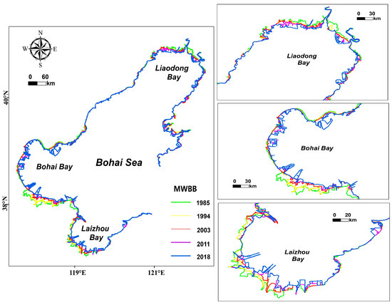 During the past 40 years, the reclaiming of the Bohai Sea has already resulted in significant spatio-temporal changes of MWBB. Marine constructions, such as ports and wharves, are bulging along the coast and extending rapidly toward the ocean, and the boundaries tend to be complex. This phenomenon is particularly obvious in Laizhou Bay, Bohai Bay, and Liaodong Bay (Figure 6).