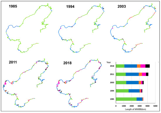 Spatio-temporal changes of the boundary types of the Bohai Sea in Phase 5. Green, blue, orange, red, and black denote the natural boundary, pond dam, industrial and urban area, marine construction, and protective dam, respectively.