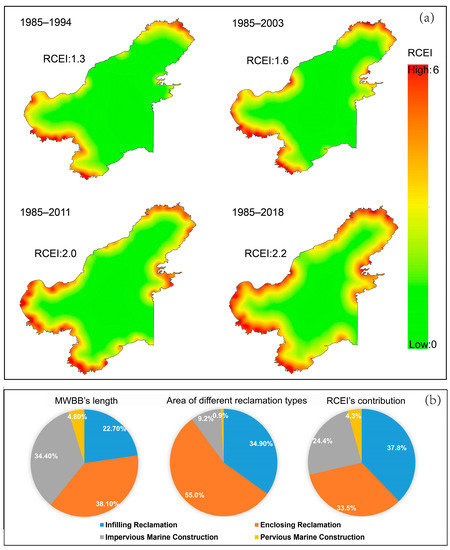 Spatio-temporal changes of the RCEI in the Bohai Sea (a) and the ratio of MWBB’s length, RCEI’ s contribution, and the area of different reclamation types (b).