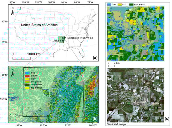 The study area is located in Arkansas, USA (33°00′16′′–36°29′58′′N, 89°38′39′′–94°37′05′′W), as shown in Figure 1a,b. The region is located in the middle and lower Mississippi River and has a temperate climate with a long summer and short winter, an average annual rainfall of 1220 mm, and abundant water resources. Arkansas is the number one producer of rice in the United States, accounting for over 40% of the country’s rice production [51]. The eastern Mississippi River Valley is Arkansas’ main crop growing area, with rice, cotton, soybeans, corn, and peanuts as the main crops, as shown in Figure 1b,c. The large amount of rice grown and the abundance of crop types in Arkansas enables the testing of the models’ ability to identify rice in complex environments and facilitates analysis of crop types that are easily misclassified as rice.