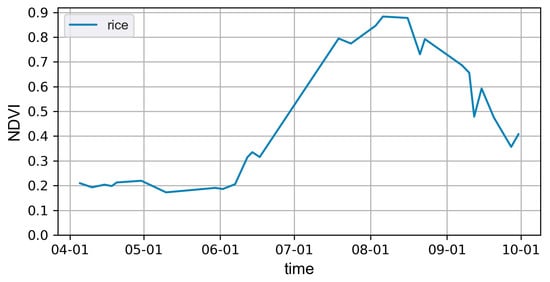 (2) Maximum composite. Based on the maximum composite method, one NDVI map is synthesized every two months, corresponding to the early (April and May), middle (June and July), and late (August and September) rice growth periods, and the three NDVI synthesis maps are integrated into a single bimonthly NDVI map. The NDVI values in the cloud-covered areas are relatively low, so the maximum composite can effectively reduce the influence of clouds on rice identification [52,53].