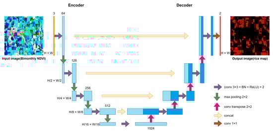 The core structure of U-Net is its symmetric encoder–decoder structure, skip connection and transpose convolutional upsampling approach, as shown in Figure 5. The U-Net’s encoder is the feature extraction path, which is responsible for extracting the spatial and temporal features from the three bimonthly NDVI data. The decoder is the image resolution recovery path, which uses the transpose convolution operation to stage a recovery of the image resolution. In addition, skip connection operation is used to connect the feature maps of the encoder and decoder. The skip connection cleverly fuses the low-level features and high-level features of the network, allowing the network to learn both low-level rice morphological features and high-level complex semantic features.