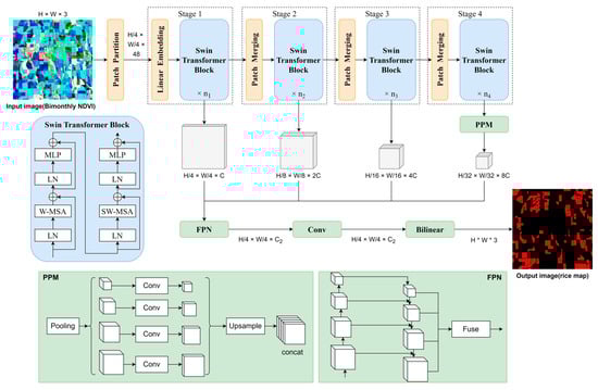 The Swin Transformer is a network entirely based on the attention mechanism and shifted windows, as shown in Figure 7. The attention score for each pixel is obtained by computing the relationship between each pixel and all remaining pixels in the window. It helps to find the more rice-concerned features from the images. Moreover, the Swin Transformer has a hierarchical structure similar to the CNN network architecture, reducing the image size in stages while increasing the number of image layers. This hierarchical structure significantly reduces the computational effort of the network. The Feature Pyramid Networks (FPN) [58] in Figure 7 fit well with the multi-layer structure of the Swin Transformer and can resolve different-sized feature maps simultaneously. The Pyramid Pooling Module (PPM) [59] enhances the accuracy of the FPN by using multi-ratio global pooling in the output of the last layer of the Swin Transformer.