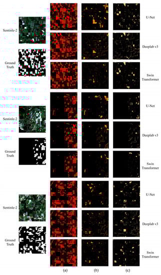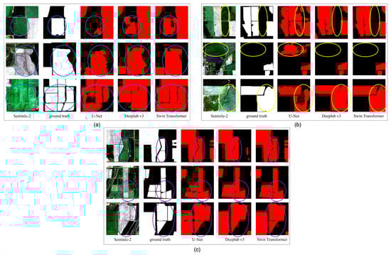 The Swin Transformer’s prediction results are more accurate than those of U-Net and DeepLab v3. The Swin Transformer identifies complete rice fields with accurate boundaries. The results for the Swin Transformer in group (b,c) show that the rice field boundaries identified by the Swin Transformer differ from the true values by only approximately one pixel. Compared to U-Net and DeepLab v3, fewer non-rice pixels were incorrectly identified as rice in the Swin Transformer’s results. This indicates that the Swin Transformer has a more accurate recognition of rice, which corresponds to the highest precision of the Swin Transformer in Table 2.