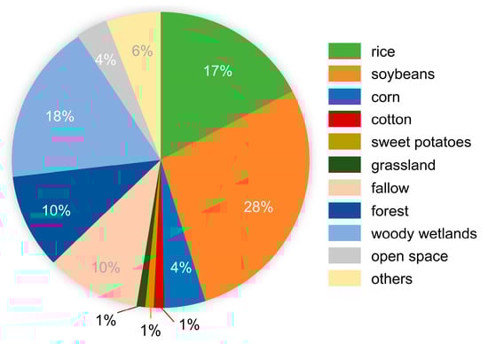 The percentages of land use types in the test data are shown in Figure 10, and the crops include rice, soybeans, corn and cotton. Figure 10 shows that soybean, woody wetlands, rice, forest and fallow are the most dominant types of land use in the test data.