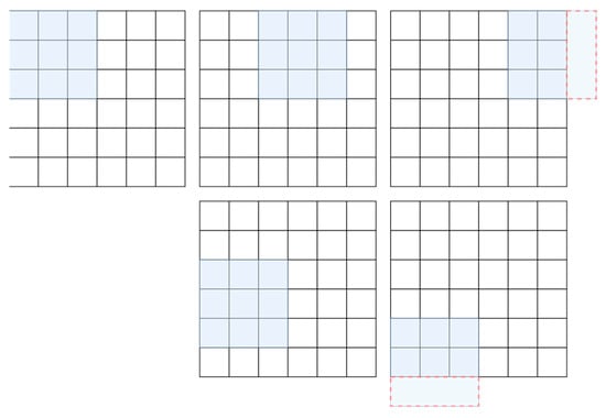 DeepLab v3 benefits from its parallel atrous convolution structure, which allows it to obtain highly accurate rice identification results. However, its eight-fold reduced feature maps are upsampled directly to the original resolution by bilinear interpolation, which can result in less accurate boundaries. The reason for the shift to the upper left in the DeepLab v3 results is that the main method for reducing the image resolution is by convolution with a stride of 2. When the stride is 2, for the case where the image resolution is even and the convolution kernel is odd, there is a missing row at the bottom right, as shown in Figure 12. When this accumulates through multiple layers, it causes the positive features in the feature map to gradually shift toward the upper left corner [60], which causes the rice fields identified by DeepLab v3 to be shifted to the upper left.