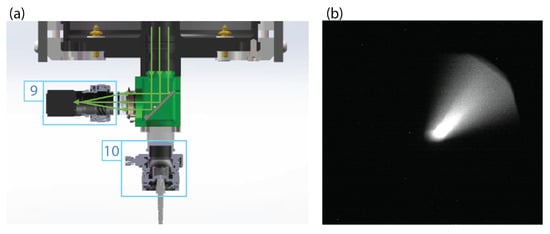 The T2 lidar performance is maximized when properly aligned. The following procedure and components were designed to align the T2 lidar: First, the flip mirror is turned to reflect all light to the side camera (9) as illustrated in Figure 4a. Motorized actuators (6 in Figure 1b) are used to bring the center of the “comet” to the middle of the camera image (Figure 4b), so that the laser beam is parallel to the telescope field of view. Once the laser is aligned, the position of the fiber is centered by adjusting the XYZ positions of the optical fiber eyepiece (10 in Figure 1b and Figure 4a) to maximize the intensity of the signal (e.g., photon-counting rate) from the detector. A similar eyepiece for the fiber is also placed at the exit of the filter case (11 in Figure 1b). The lidar underwent a similar alignment process before the atmospheric observations.