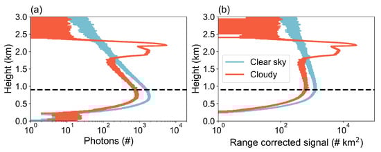 (a) Raw signal and (b) range-corrected photons received by the T2 lidar operated in continuous mode. The returns with a clear sky after sunset at 9 pm LT on 20 June 2022 (blue line) and a cloudy sky after sunset at 8:40 p.m are shown. LT on 21 June 2022 (red line). The arrival time data of received photons were binned to 1 ns, corresponding to the range resolution of 15 cm. The horizontal dashed line indicates the minimum full overlap height of about 900 m.