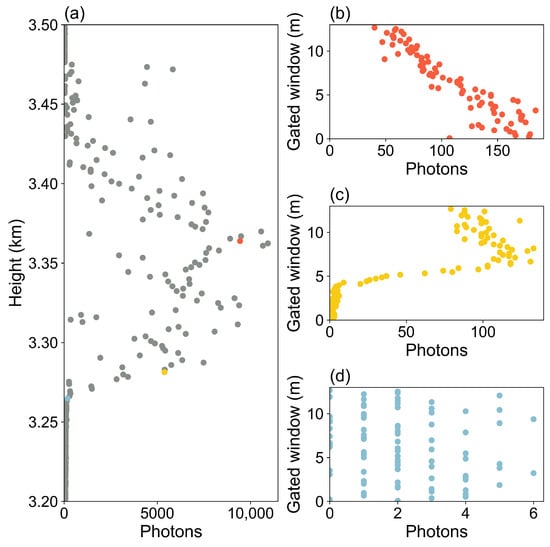 (a) Profiles of photons received with the vertically pointing T2 lidar operating in time-gated mode. Each point represents the number of photons received from a specific height in an 80 ns gated window (corresponding to 12 m) within 1 s. The subpanels on the right show the distribution of photons received within three selected gated windows at the locations given in (a) by colored points coded to match the color used in each subpanel: (b) inside the cloud (red), (c) at the cloud base (yellow), and (d) below the cloud base (blue). The arrival times of photons within each gated window were binned to 1 ns, corresponding to 15 cm range resolution.