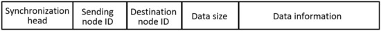 In TF-MAC, the DATA packet mainly contains the synchronization header, the sending node ID, the destination node ID, the data size, and the data to be transmitted. Figure 3 shows the DATA packet format. In a network with N layers, since the anchor node has no forwarding task, the data size in each packet of the anchor node is . Then, according to the quantitative relationship of nodes between adjacent layers, the data size is successively allocated to the upper layers. The data size in a single packet of layer—L is calculated by Equation (6). After calculating the data size of each layer, the length of DATA packet can be calculated according to the DATA packet format.