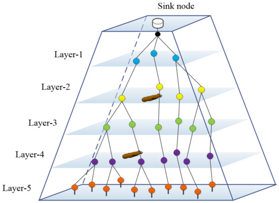 Sensor nodes need different hops to transmit data to the sink node and thus are located at different layers. A sensor node that requires N hops to transfer data to the sink node belongs to layer-N. In addition, a node of layer-N can reach at least one node of layer-N-1 in the transmission range as a relay, but none of the nodes of layer-N-2 are in its transmission range.
