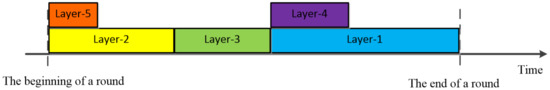 Figure 4 shows a five-hop data collection network, assuming that the transmission path of the entire network is established. We can observe that layers separated by two layers can simultaneously transmit data to nodes in the upper layer without conflict, such as layer-5 and layer-2. Thus, in every round, the time slots of nodes two layers apart can overlap. Figure 5 shows the time slot distribution for each round of the five-hop data collection network in Figure 4. The closer the layer is to the water surface, the longer the time slot. Through overlapping time slot division, the nodes of different levels can communicate in parallel in vertical direction. The throughput is improved and the end-to-end latency is significantly reduced.