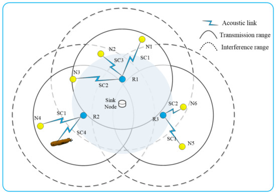 We assume that the clocks are synchronized in the entire network, which can be performed with any synchronization algorithm [29]. Each node has a unique ID number. All nodes know the three-dimensional coordinates they are deploying. This can be achieved by a node hierarchical positioning mechanism for large-scale multi-hop UASNs [33]. We assume all of the nodes are static or drift slightly with the ocean current around their fixed position.