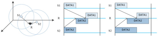 Different from the terrestrial wireless sensor network, the high propagation delay of underwater acoustic channels leads to serious spatial-temporal uncertainty in UASNs. As shown in Figure 7, both sender 1 and sender 2 send packets to the same receiver. Since the distance between them and the receiver is different, their packets do not arrive at the receiver at the same time. In this case, there will be a conflict if sender 1 and sender 2 use the same channel. Since TF-MAC allocates different subchannels to nodes in the same interference range, there will be no packet conflict caused by the spatial-temporal uncertainty at the receiver.