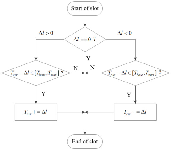 The proposed adaptive packet length algorithm is shown in Figure 8. Each node has a buffer to hold data to be sent, whose size is fixed. If the buffer is full, newly generated data will overflow from the buffer, resulting in loss of data. At this point, increasing the length of the packet can effectively alleviate the loss of data and reduce the packet header overhead. If the traffic load is light, reducing the packet length can send the packet in a timely manner and thus reduce the end-to-end delay. This algorithm is an adaptive packet length algorithm based on a fixed gradient. represents the fixed gradient, whose absolute value is fixed. Whether the sign of the fixed gradient is positive or negative is determined by the gradient rise and gradient fall of the traffic load. If the amount of data in the buffer remains unchanged within a certain range, the fixed gradient changes to 0. The packet length is updated adaptively at the beginning of the time slot. If , will increase; if , will decrease; if , will remain unchanged. The packet length cannot be less than the uniform packet length of the node nor greater than the maximum packet length.