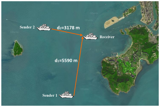 We evaluate the spatial-temporal uncertainty of UASNs in a sea experiment using our existing underwater acoustic modems [40]. It provides the feasibility for the adaptive packet length algorithm. Our experiment was conducted on 2 December 2020 in Sanya Bay, China. Three ships depart from the dock and anchor at their respective fixed locations, representing two sending nodes and one receiving node. By locating the ships on the map, we create the topology as shown in Figure 9.
