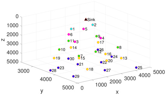 We implement simulations on Aqua-Sim, an NS-2 based simulator for underwater sensor networks [41]. We deployed a sink node in the center of the 5000 × 5000 m area on the water surface. In the 5000 × 5000 × 5000 m area, 30 or 50 underwater sensor nodes are placed according to the layered network with a tree topology, representing sparse and dense networks, respectively. Sparse topology is shown in Figure 12. Nodes of the same color are on the same layer. Each underwater node generates data following a Poisson process. The data generation rate provided varies from 50 bps to 500 bps. Except for TF-MAC, DATA packets are generated at a fixed size of 200 B. The size of the control packet is 20 B. In our simulation, each run lasts 10,000 s, and we count the average value of twenty runs. The summary of simulation parameters is shown in Table 2.