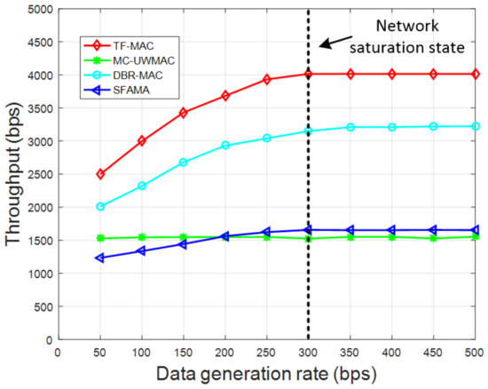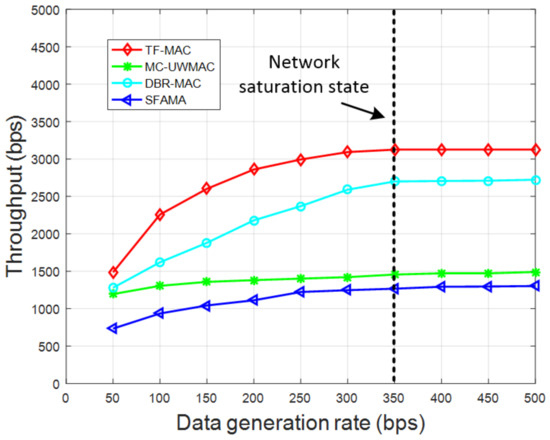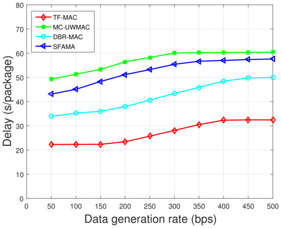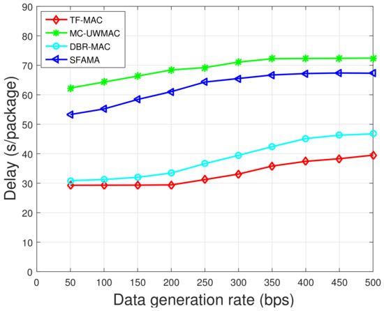 For SFAMA, as the data generation rate increases, more RTS collisions occur leading to longer delay. In DBR-MAC, when data generation rate increases, data flow may become congested at critical nodes. To prevent congestion, it introduces a conservative backoff algorithm, which increases the delay performance gap between DBR-MAC and TF-MAC. For MC-UWMAC, the control channel adopts the time-slot method; thus, the node can only send RTS in its own time slot. In addition, the smaller data channel bandwidth increases the transmission time in MC-UWMAC. In TF-MAC, DATA packets are transmitted without conflict. Initially, the network does not reach saturation; thus, the delay is basically unchanged in TF-MAC. As the data generation rate increases further, the buffer becomes full; thus, the delay of all four MAC protocols will flatten out.