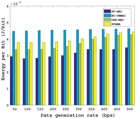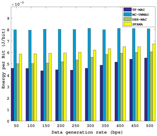 Figure 17 and Figure 18 show that the average energy consumption of TF-MAC is lower than those of the other three protocols under the same data generation rate. This difference is mainly due to the power control algorithm for the nodes at each layer in the TF-MAC. Underwater nodes use optimized transmission power, which not only saves energy but also avoids unnecessary interference. In contrast, the other three protocols use a fixed amount of transmitting power to forward packets to the sink node. Second, the adaptive packet length algorithm in TF-MAC enables the node to increase the data size sent in a single slot when the traffic load increases, which further reduces energy consumption caused by the packet header. In MC-UWMAC, the small data channel bandwidth increases the transmission time, which results in greater energy consumption.