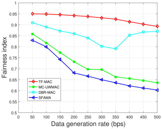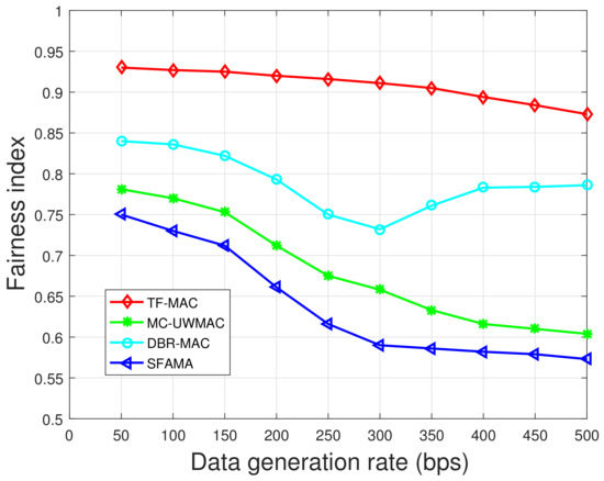 Figure 19 and Figure 20 show that TF-MAC has the highest fairness index. Moreover, since TF-MAC and DBR-MAC both consider the application of the data collection network, their fairness is obviously higher than that of MC-UWMAC and SFAMA. Overlapping time slot division scheme in TF-MAC enables the nodes in the upper layer to have longer time slots, allowing larger packet to be sent. The DATA packet contains not only the data from the sending node itself but also the data from the lower layers. This means that nodes of different depths have the same priority to transmit data to the sink. DBR-MAC selects the optimal forwarding node for the deeper nodes to improve their chances of transmitting data to the sink node. However, depth-based backoff algorithms greedily give priority to key nodes to maximize performance, which reduces fairness. As the data generation rate exceeds the available capacity, the backoff algorithm changes from a depth-based algorithm to a conservative algorithm, thus the fairness index increases.