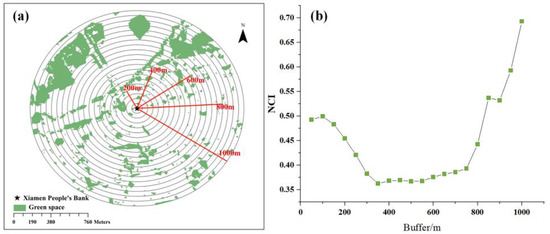 Schematic of the green space compactness for different buffer zones. (a) Xiamen People’s Bank of China is taken as an example. The green space within 1 km of the People’s Bank of Xiamen is divided into 20 buffer zones; (b) The value of green space compactness of 20 buffer zones. (Note: NCI is the value of green space compactness).