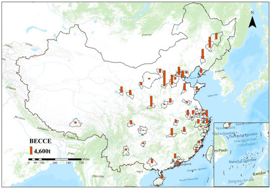 The BECCE of the People’s Bank of China in the 59 selected cities is mainly between 250 and 4000 t. The significant differences are obviously exhibited in BECCE among regions. BECCE was generally higher in the north. Taiyuan (9,101,392 tons of CO2), Changchun (6,236,725 tons of CO2), and Xian (6,111,328 tons of CO2) had the three highest BECCE. In the south, BECCE was lower; BECCE was the lowest in Sanya City (255,317 tons of CO2), as shown in Figure 4.