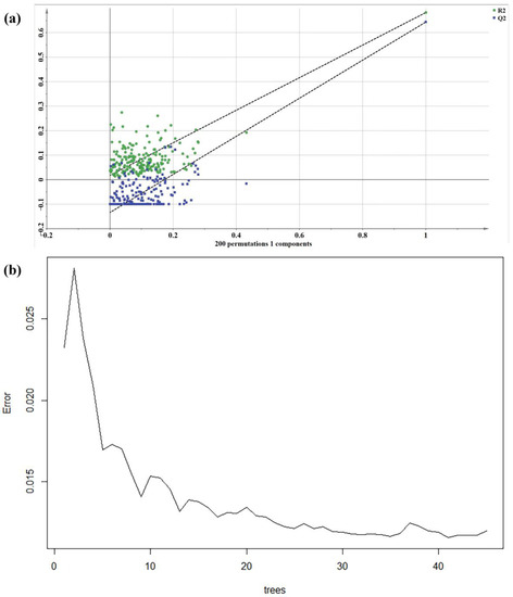 Validation of models. (a) Permutation test of partial least squares regression model. Criteria for model validation: all the R2 and Q2 are smaller than the original values according to the sequence distribution of the partial least squares regression model for the 250 m buffer zone; (b) Generalization error and number of regression trees of the random forest model. The number of regression trees corresponding to the minimum error value is selected.