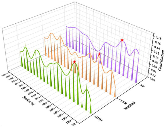 Factor detection was used to estimate the degree to which GSC can explain BECCE. The degree of explanation varied between 0.023 and 0.168 across the 20 buffer zones. From the 50 m to the 250 m buffer zone, there were large fluctuations in the degree of explanation; the lowest value was in the 150 m buffer zone, and the highest value was in the 250 m buffer zone. From the 300 m to the 1000 m buffer zone, variations were relatively small (0.07–0.12). The degree of explanation was the highest for the 250 m buffer zone. Results from the GDM also indicate that GSC has the largest effect on BECCE in the 250 m buffer zone (Figure 6).