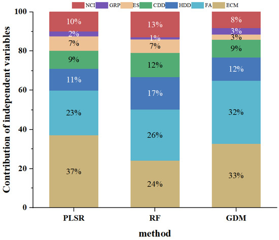 Contribution of independent variables to building energy consumption carbon emission obtained by PLSR, RF, GDM. (Note: NCI was the value of green space compactness. GRP represents Gross Domestic Product per person. ES represents education spending. CDD represents cooling degree days. HDD represents heating degree days. FA represents the building’s square foot area. ECM represents energy consumption membership. The unit of GRP and ES is yuan, the unit of CDD and HDD is °C·day, the unit of FA is hm2, the unit of ECM is person. PLSR represents partial least squares regression. RF represents random forests. GDM represents geographical detector model).
