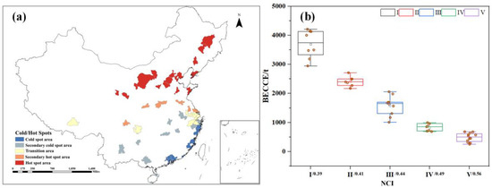 Optimization of the green space compactness. (a) Distribution of hot and cold spots of BECCE; (b) The relationship between green space compactness and BECCE. Reductions in BECCE are associated with the replacement of GSC of one category with that of another category. (Note: I/0.39, II/0.41, III/0.44, IV/0.49, V/0.56 represented mean of the NCI corresponding to the hot spot, secondary hot spots, transition area, secondary cold spots, and cold spots, respectively. GSC represents green space compactness. NCI was the value of green space compactness. BECCE represents building energy consumption carbon emission. The unit of BECCE is ton).