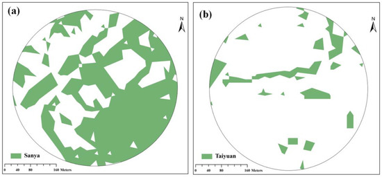 The transformation of two green space compactness types. (a) The distribution of green spaces within 250 m of the People’s Bank of Sanya; (b) The distribution of green spaces within 250 m of the People’s Bank of Taiyuan.