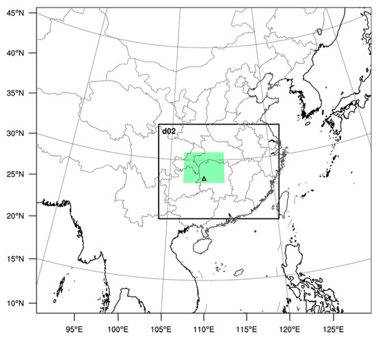 The model domains used. The outer region is the parent domain (9 km), and d02 is the inner domain (3 km). The innermost box, shaded green, denotes the area of the squall line system (approximately 27°–31°N, 107°–113°E), and the triangle at the bottom of the green area indicates the location of the Huaihua station.