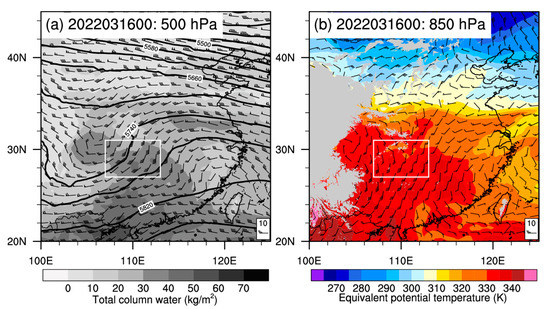 The ERA5 data for (a) 500 hPa geopotential height (solid black, contoured every 30 m) and wind barbs (m/s) superimposed on total column water (kg/m2; grayscale shading) and (b) 850 hPa equivalent potential temperature (K; color shading) and wind barbs (m/s) at 0000 UTC on 16 March 2022. The gray shading in (b) denotes terrain height > 1.5 km. The white rectangles in (a,b) represent the area of the squall line system.
