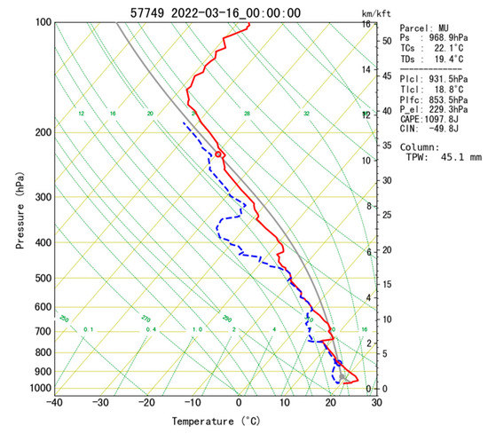 Skew T-logP diagram for Huaihua (triangle in Figure 1) at 0000 UTC on 16 March 2022. The red and blue lines show temperature and dewpoint temperature profiles, respectively. The gray curve represents the ascending path of the most unstable parcel. The yellow background line, sloped at a 45° angle, denotes temperature lines.