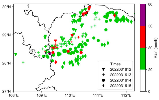 Spatial distribution of hourly rainfall above 20 mm/h during the mature stage of the squall line. The time values are given in the legend.