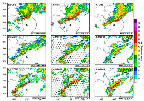 The simulated Z distributions and the coupling of updrafts to high Z values (Figure 9d,g) are consistent with radar observations. Both schemes also reproduce a ZDR column-like feature stretching up to the freezing level in the convective core (Figure 9e,h), though the simulated ZDR columns are narrower and weaker (1.5–2.5 dB) than observed. The MORR scheme additionally exhibits a ZDR peak (>3 dB; near 28.0°N, 109.7°E) near the surface ahead of the ZDR column, along with a low Z value, suggesting the existence of large raindrops within a region of weak convection, where this would be unexpected. Previous studies [26,38] found similar ZDR spikes in MORR and attributed them to the fact that the parameterization of the rain breakup rate in MORR depends on the value of the mixing ratio [28], so that the low efficiency of rain breakup in low-precipitation regions with a small mixing ratio could result in locally large drops. In the stratiform region, the melting layer that manifests as a decrease in ZDR with height is better captured by MORR than WDM6, though its height is slightly lower than observed. The KDP columns, which are co-located with the ZDR columns, are located adjacent to the updraft region in MORR and WDM6 (Figure 9f,i), in agreement with expectations. The KDP values for the KDP column in both schemes were close to the radar observation values (0–3°/km) as with, e.g., [68,69], but neither scheme captured the distinct KDP overhang structure. As with the ZDR columns, the KDP column in the simulations is clearly narrower than in the observations, especially in WDM6.