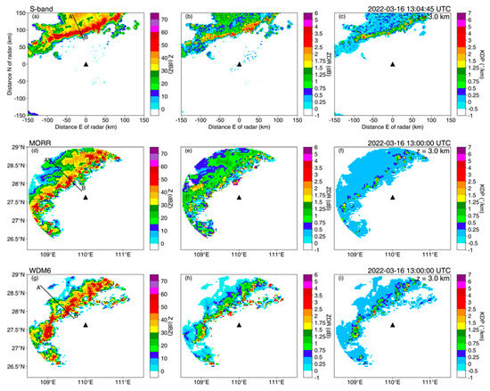 (a,d,g) Radar reflectivity (Z; dBZ), (b,e,h) differential reflectivity (ZDR; dB), and (c,f,i) specific differential phase (KDP; °/km) from (a−c) the S-POL radar observations and the POLARRIS-f simulations converted from the WRF output using (d–f) MORR and (g–i) WDM6 microphysics schemes, at 1300 UTC on 16 March 2022 at an elevation of 3 km. The convective region was divided based on the criteria revised by Powell et al. [59] and is indicated by black dots. The triangle in each panel indicates where S-POL is situated. Lines A-B in (a), (d), and (g) indicate cross-section lines of Figure 9.