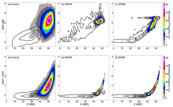 To statistically analyze and further evaluate the microphysics of the warm cloud layers, joint probability density functions (PDFs) in Z-ZDR and Z-KDP space were constructed and normalized by peaks in frequency. Each PDF encompassed 3 h of radar observations or POLARRIS-f simulations, covering the Huaihua radar coverage (150 km radius), and spanning from the surface to 3 km altitude to ensure only liquid drops. Peak frequencies of the observed Z and ZDR are at 30 dBZ and 0.85 dB for stratiform samples (black contours in Figure 8a) and 50 dBZ and 2.5 dB for convective samples (colored shading in Figure 8a). For the radar observations of the convective samples, the modal distribution of Z and ZDR values with frequencies higher than 30% extended from 43 dBZ to 55 dBZ, and from 1.5 to 3.2 dB, respectively, further supporting the conclusion drawn from Figure 7a,b that the clouds of the convective region are composed of larger raindrops. For convective samples in MORR, the simulated Z and ZDR values with frequencies higher than 30% were confined to ~48 dBZ and ~2.2 dB (Figure 8b), indicating that the modal distributions occupy a smaller phase space compared to the observations. Despite effectively reproducing the peaks in frequency of moderate raindrops, MORR fails to capture the frequencies of over 30% of large raindrops in the top right side of the observational phase space. For observed stratiform precipitation, the distribution of Z and ZDR values with frequencies over 30% extended from 15 to 38 dBZ, and from 0.2 to 1.2 dB, respectively. The MORR scheme exhibits high frequencies for large Z and ZDR values that are not observed in reality; values with frequencies higher than 30% exceeded 40 dBZ and 2.0 dB, implying that the rain rate and drop sizes in the stratiform region are both exaggerated [64]. By contrast, the modal distributions of the WDM6 scheme match the radar observations more closely and exhibit a similarly broad range of Z values for both convective and stratiform regions, despite an apparent narrower distribution of ZDR for a given reflectivity than the observations. The WDM6 simulations have a truncated ZDR, which is in agreement with the findings of earlier studies [19], due to the use of a different shape parameter.