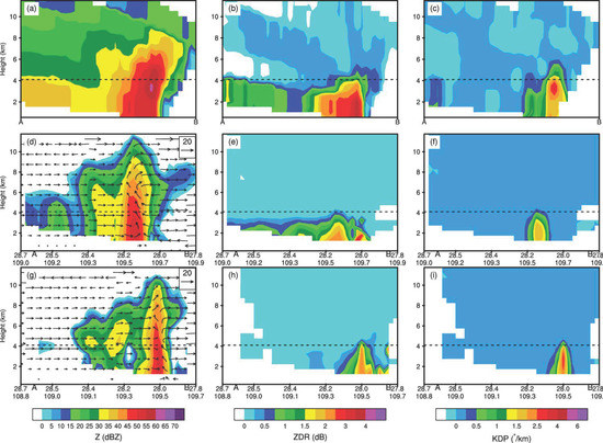 Vertical cross sections oriented perpendicular to the squall line can be used to examine the structure of the system in more detail (Figure 9). The dashed black line in Figure 9 indicates the freezing level, which was obtained from a 1200 UTC sounding at the same site as S-POL and is located at ~4 km. In the cross sections of Z and ZDR from S-POL (Figure 9a,b), the trailing stratiform region is split from the leading convective line by a weak echo transition zone with lower Z and ZDR values. The melting layer in the stratiform part is marked by a well-pronounced abrupt drop in ZDR with altitude (Figure 9b). Another notable polarimetric signature is the ZDR column associated with the convective updraft, which is located at the front of the squall line and extends up to a height of 5 km (i.e., ~1 km higher than the freezing level). The maximum ZDR (~3.5–4 dB) was concentrated between the surface and a height of 2 km (Figure 9b), corresponding to slightly lower KDP (~1.5–2°/km) beneath an overhang structure in the KDP profile (Figure 9c), which indicates a moderate concentration of large raindrops near the ground. This is supposed to be the result of size sorting, since large raindrops enlarge by acquiring cloud droplets when falling, whereas smaller drops are carried upwards by the rising air [65]. KDP values in excess of 1°/km were observed at the upper part of the ZDR column; this phenomenon, known as the KDP Column, is attributed to the occurrence of supercooled raindrops or water-coated hail adjacent to the updraft [66,67]. The overhang of KDP below the freezing level is associated with high Z values (>60 dBZ), which is likely due to the melting of graupel and hail into raindrops, thus resulting in increased KDP.